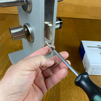 Suche an der Seite des Türblattes (wo das Schloss sitzt) die Schraube, die den Zylinder hält. Sie befindet sich auf Höhe des Schließzylinders.